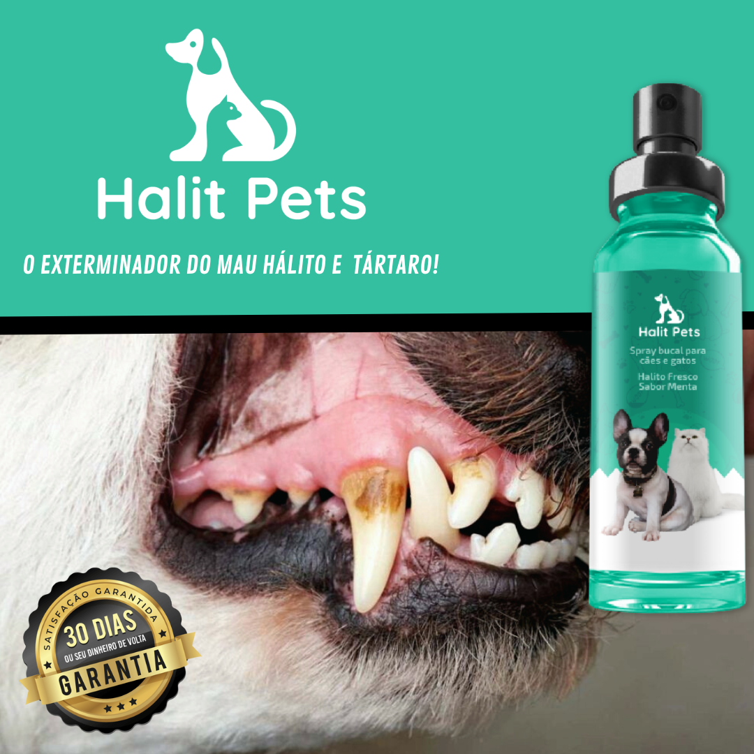 O spray Halit Pets possui uma fórmula especial, que auxilia na remoção do tártaro e de outras bactérias causadoras do mau hálito que podem afetar seu PET. Todo cão e gato tende a exalar um hálito forte. Mas, quando dá para sentir o aroma a distância e ele parece insuportável, fique de olho. Em uma situação dessa, é possível que você note uma área mais avermelhada nas gengivas e até pequenos pontos sangrando. São sintomas típicos das doenças periodontais, provocadas pelo acúmulo de tártaro e placa bacteriana nos dentes. A menor das ameaças, no caso, é seu cachorro terminar banguela. Sim, porque esses males podem abrir brechas para micróbios que atacam órgãos vitais como coração, rins e fígado.